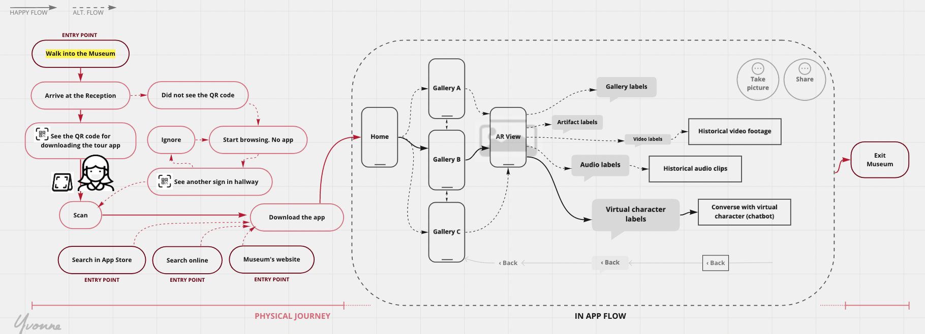I integrated the physical journey with the digital flow. The app screen shall auto-switch accord to which gallery a user is in. Multiple QR codes and free Wi-Fi info are displayed on hallways if a user lost internet connection or stopped using and later got back in.