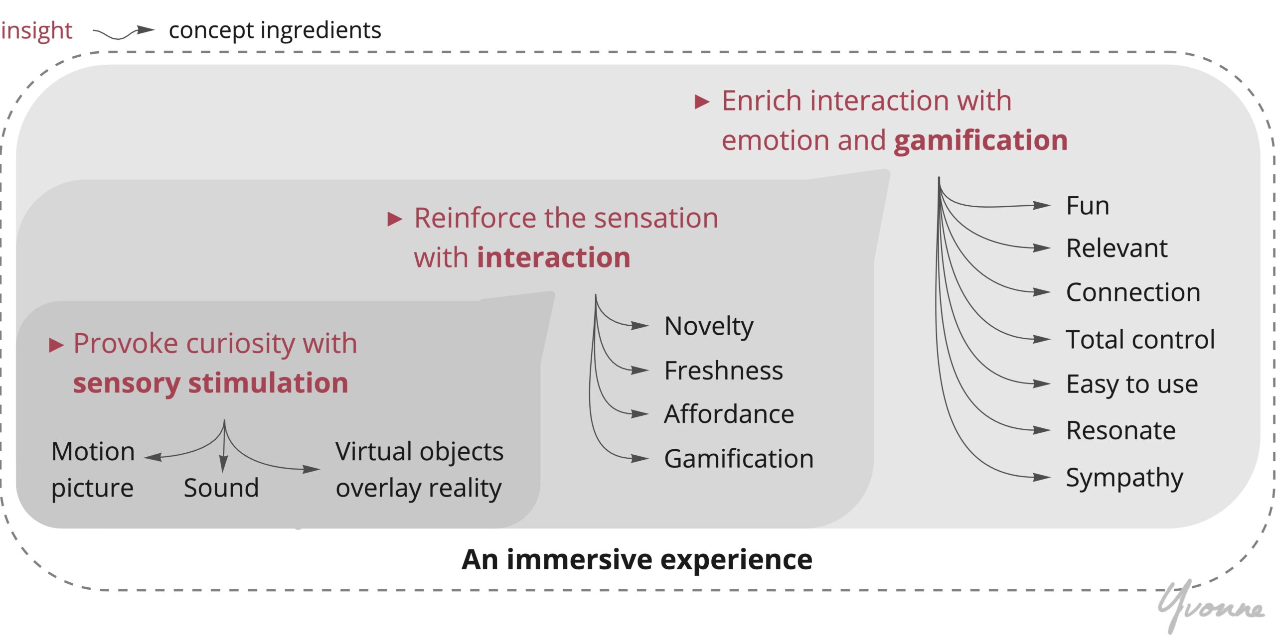 In sum, the insight is that the user’s immersion is triggered then layered at three levels. Each layer with its corresponding factors together form a cohesive immersive experience: