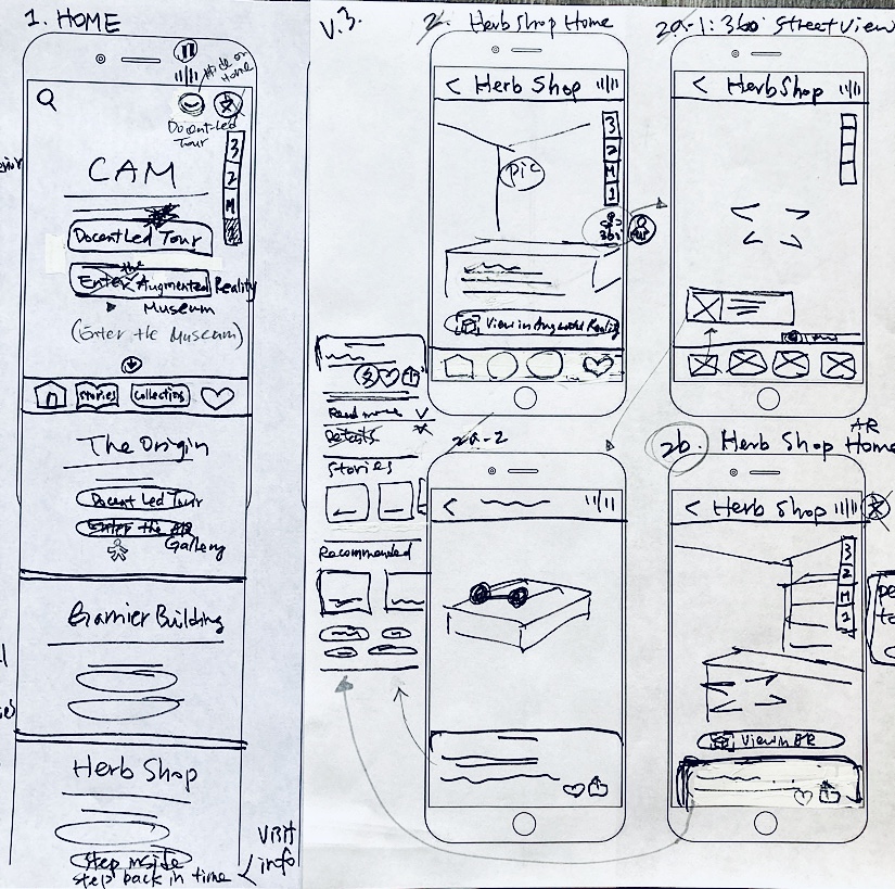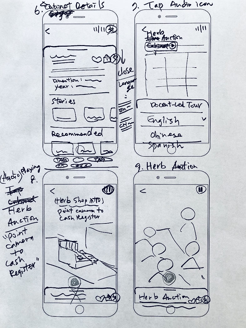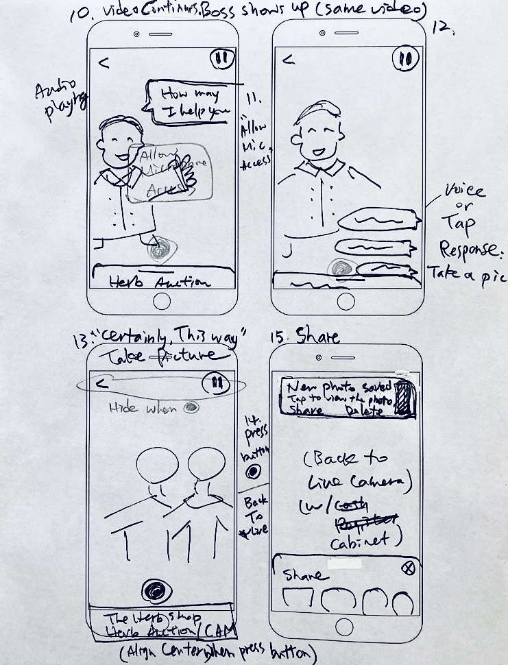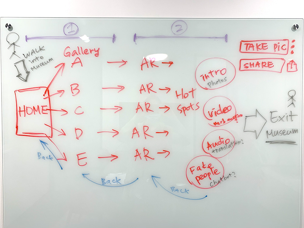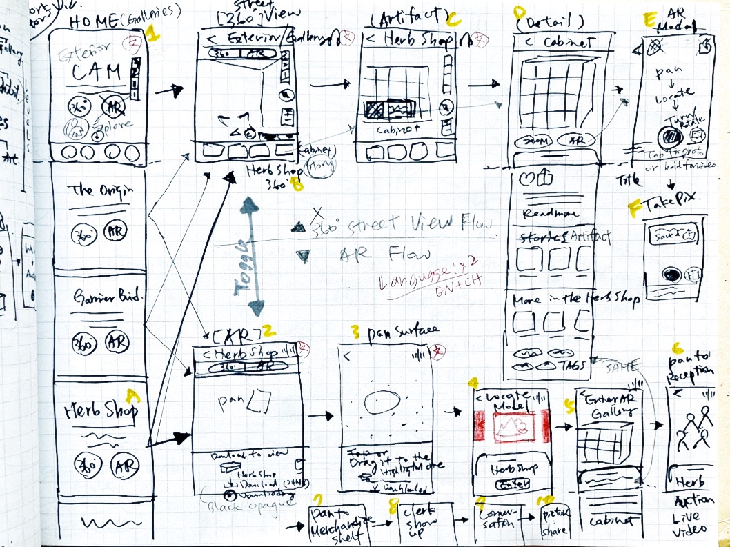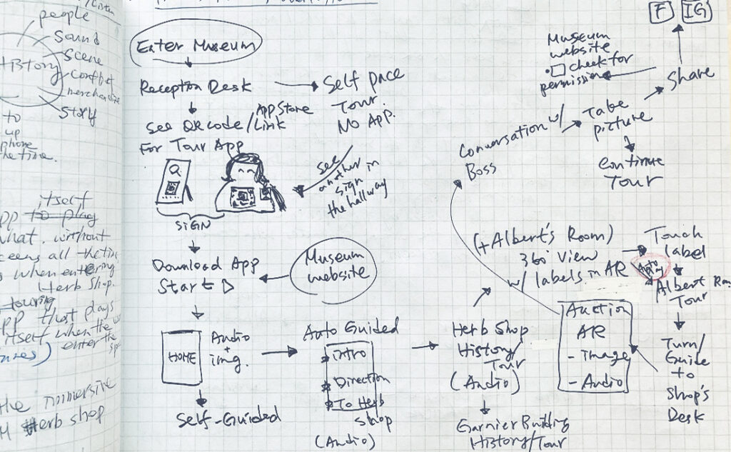 Inspired by video games, team conversation sparked the idea of showing medicine tidbits via a talk with a virtual store manager. And to bring history before people’s eyes, we can play a video of customers shopping in the store. All thoughts converged to the solution “AR Gallery” for design and test.