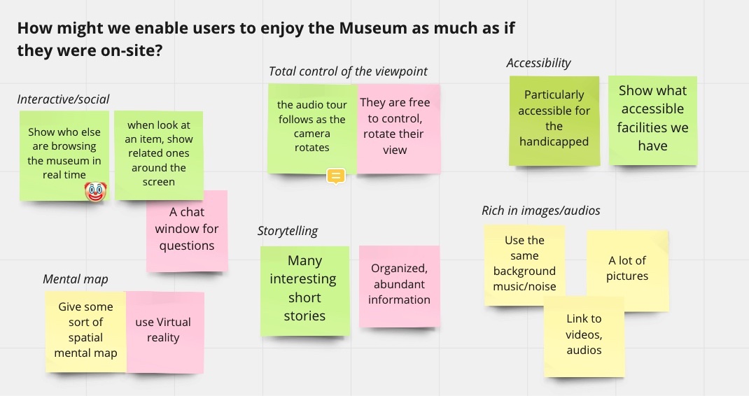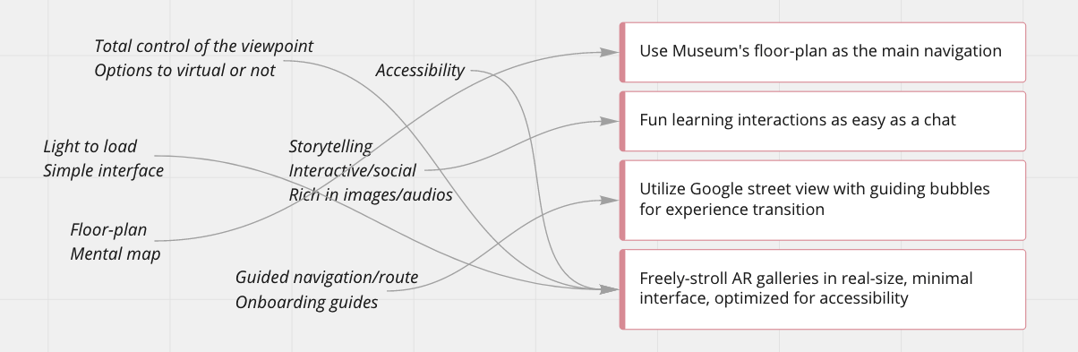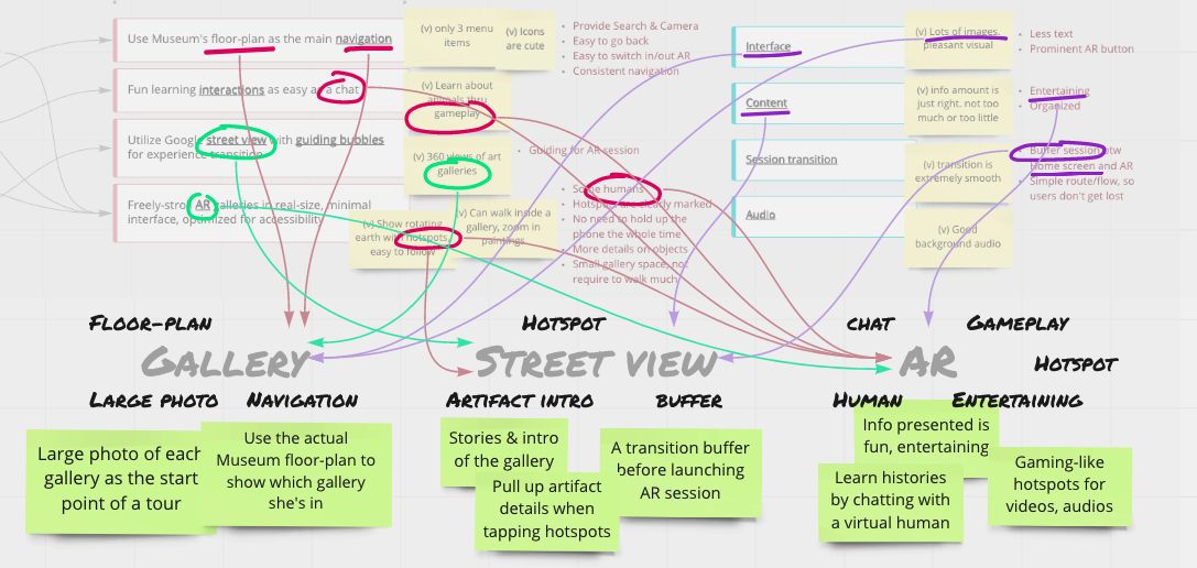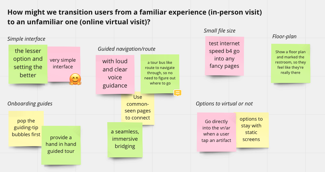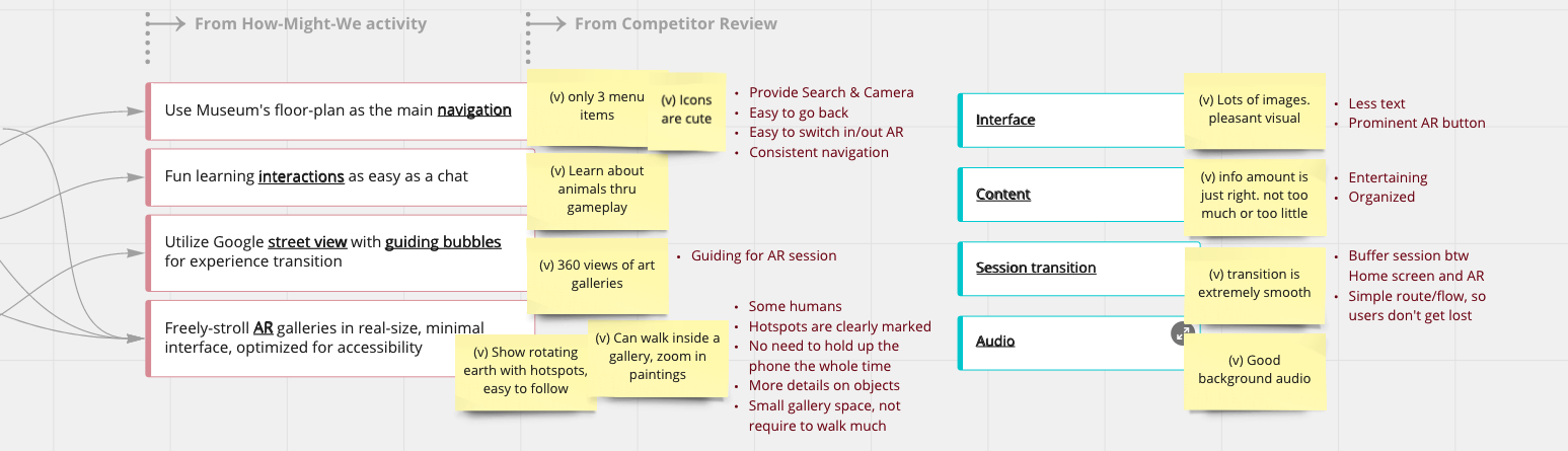 We ran a quick remote brainstorm on the how-might-we questions. Sticky notes were grouped alike to categorize. Patterns were then surfaced to inspire ideas. Accompanied with a broad review of the existing museum and AR apps and learned from their merits, we developed a hypothesis that leads to a quick solution for tests.