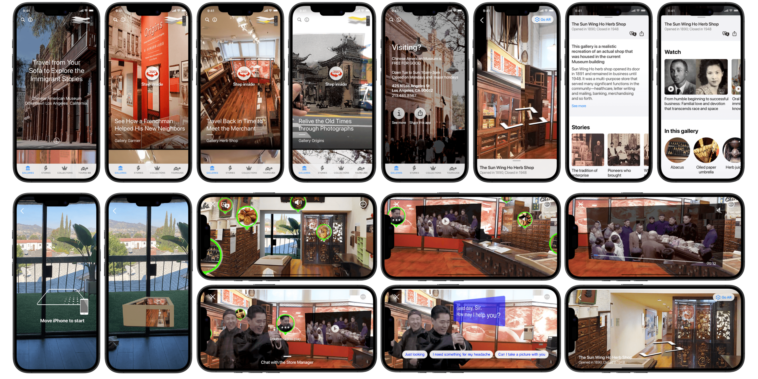 Through analysis of prominent augmented reality apps, we present the mobile app AR Gallery. It is a gateway leading users into the five galleries of the museum, telling stories in the settings of AR including videos and audio. Users can sit on a couch to see a gallery pop up in their homes, step inside to browse, learn about artifacts through audios, videos, or a dialogue with a virtual character. The project outcome is a prototype for further development, which gives remote visitors to enjoy CAM anytime, anywhere.