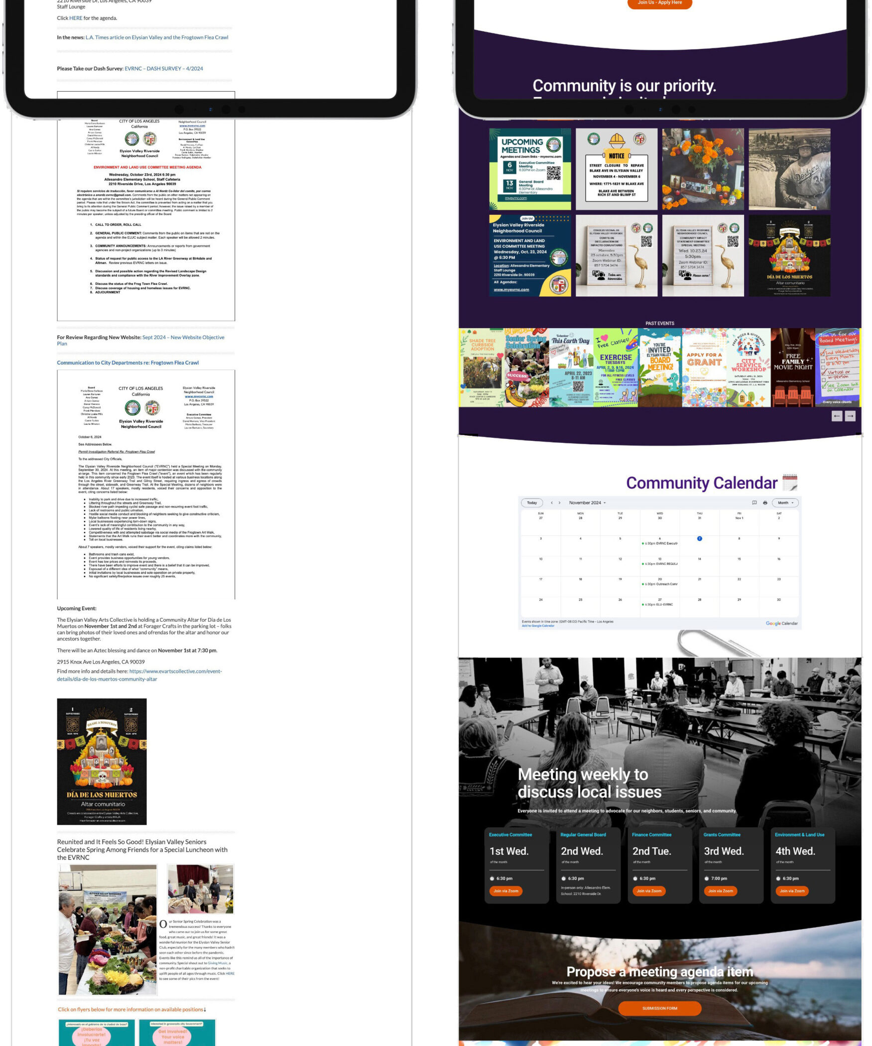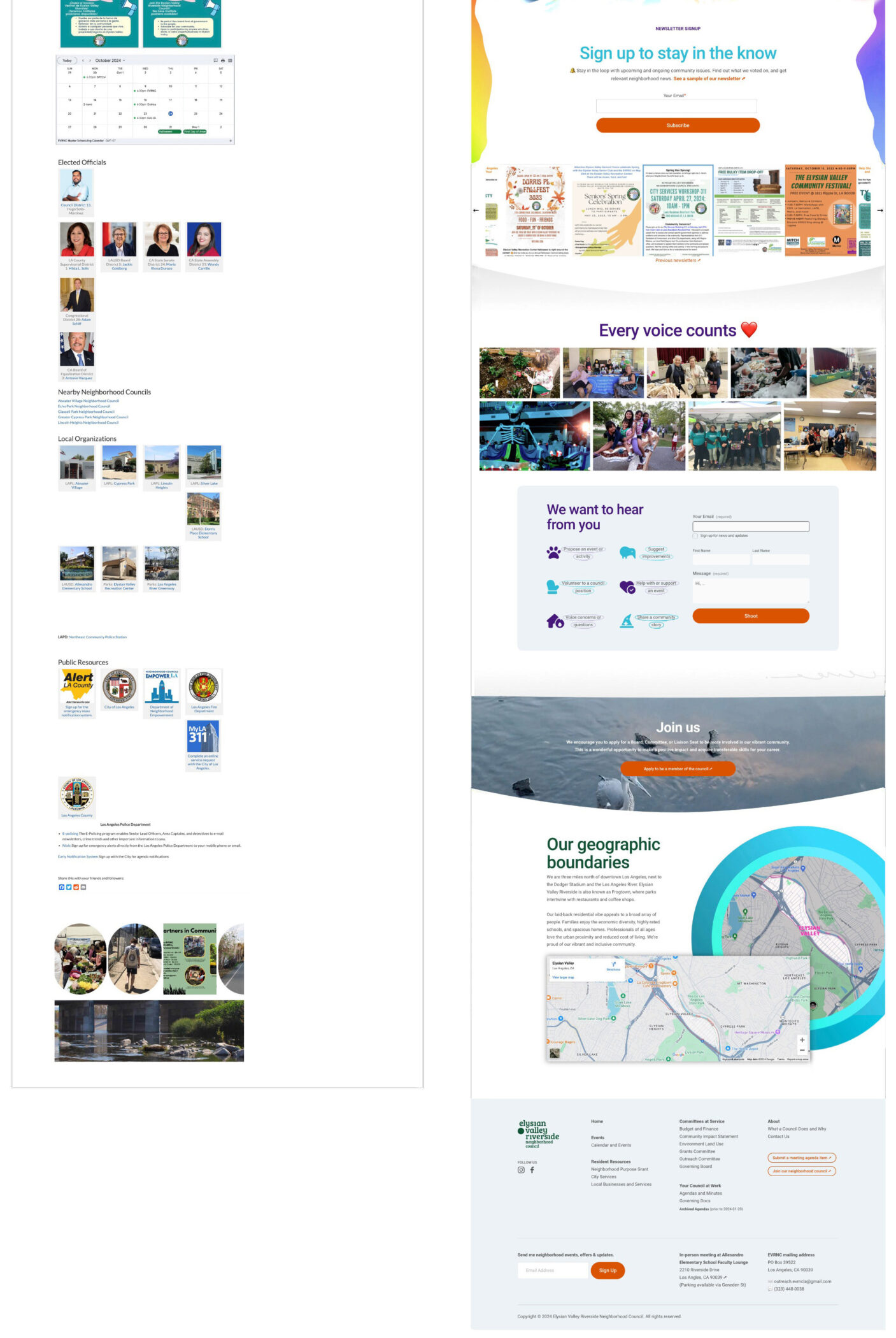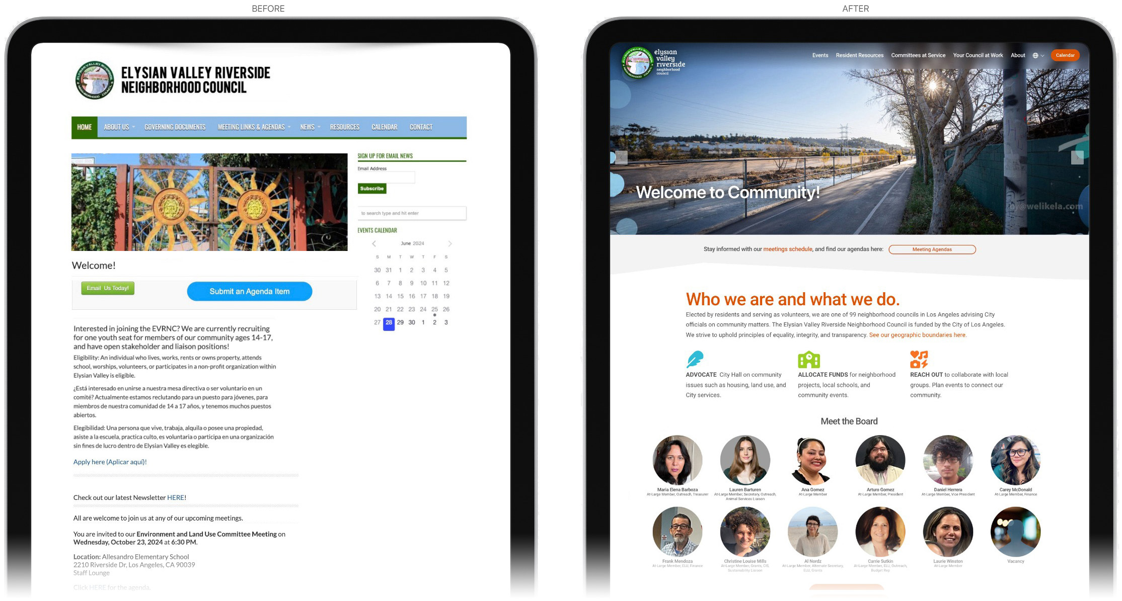 Elysian Valley Council is one of many councils in the city of Los Angeles that advises the City government on policies affecting their residents. The Council’s website had become outdated and failed to serve its purpose as a bridge between community residents and council members. Our mission was to reinvigorate the site to foster community engagement while making council resources and updates more accessible.