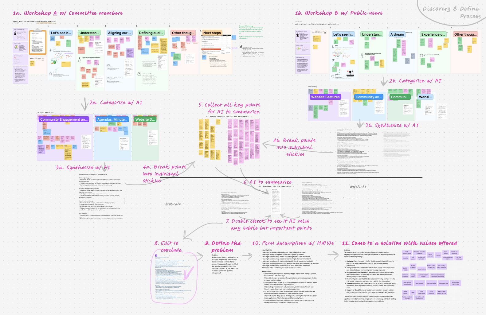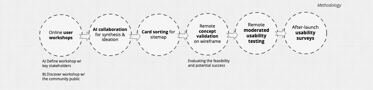 We began with online user workshops, engaging stakeholders and the community to uncover key insights and align on project goals. These sessions helped shape the website’s direction and set the stage for a user-centered design. We then used AI tools for synthesis and ideation to process these insights and generate initial concepts, followed by a card-sorting exercise to refine the sitemap.